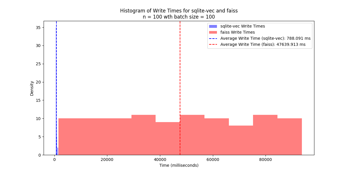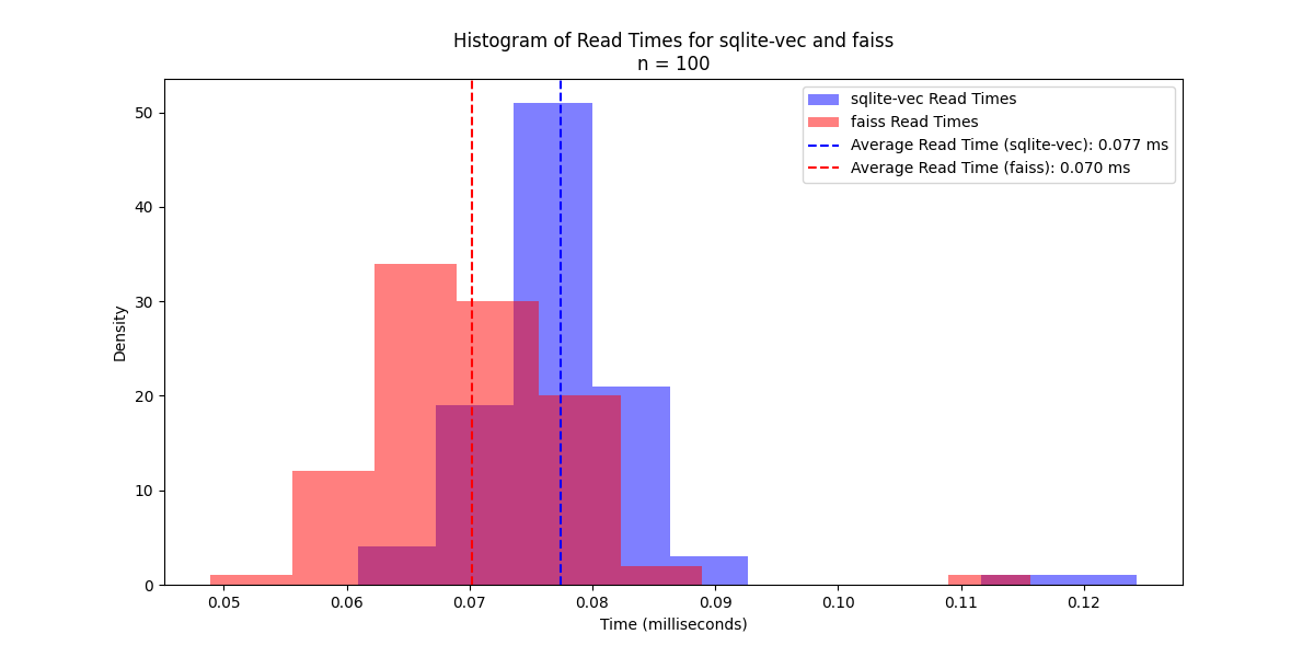 In comparison, the read times for Faiss was on average 10% faster than sqlite-vec. The modes of the two distributions highlight the differences much further where Faiss will likely yield faster read performance.