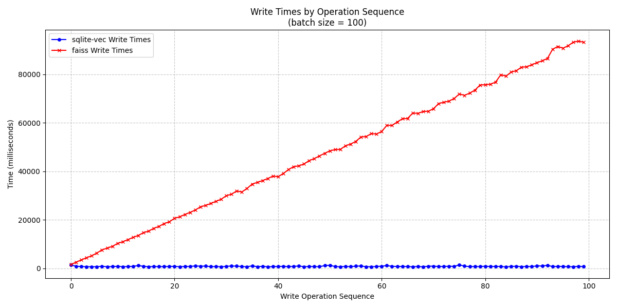 Looking at each individual write in the order that the documents are inserted you’ll see the increase in write speed as Faiss reindexes the vectors after each write.